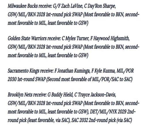 • 密爾沃基雄鹿得到:扎克·拉文、戴羅恩·夏普、2028年首輪選秀權(quán)互換權(quán)(涉及勇士/雄鹿/籃網(wǎng)三隊(duì),籃網(wǎng)優(yōu)先級(jí)最高,雄鹿次之,勇士最低)