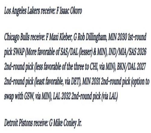 • 芝加哥公牛:馬克西·克萊伯、迪林厄姆、2030年首輪選秀權(quán)互換權(quán)(涉及馬刺/獨(dú)行俠/森林狼三隊(duì),森林狼優(yōu)先級(jí)最高)、2026年次輪選秀權(quán)(涉及步行者/熱火/馬刺三隊(duì),公牛優(yōu)先級(jí)最低,通過森林狼獲得)、2027年次輪選秀權(quán)(涉及籃網(wǎng)/獨(dú)行俠/活塞三隊(duì),公牛優(yōu)先級(jí)最低,通過活塞獲得)、2031年次輪選秀權(quán)(通過森林狼與勇士的選秀權(quán)互換獲得)、2032年次輪選秀權(quán)(通過湖人獲得)