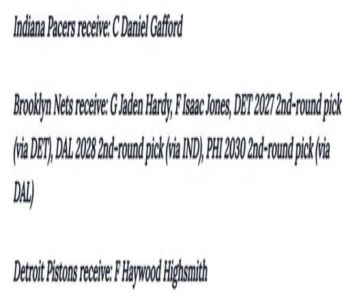 • 布魯克林籃網(wǎng):賈登·哈迪、艾薩克·瓊斯、2027年次輪選秀權(quán)(通過活塞獲得)、2028年次輪選秀權(quán)(通過步行者獲得)、2030年次輪選秀權(quán)(通過費(fèi)城76人獲得,源自獨(dú)行俠)