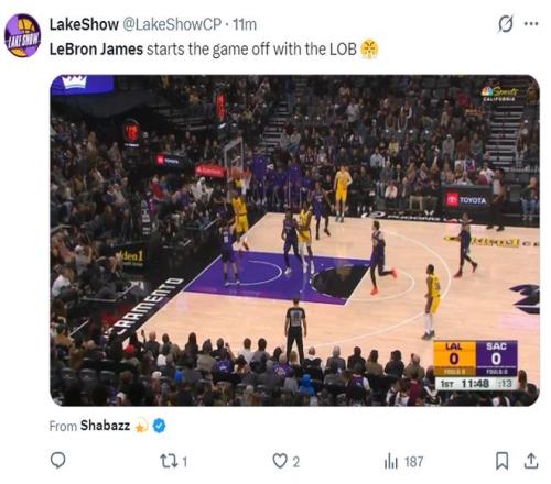 詹姆斯開(kāi)場(chǎng)第一攻就是空接暴扣,隨后兩次的轉(zhuǎn)換上籃輕松命中,開(kāi)場(chǎng)湖人6分全部來(lái)自于41歲的勒布朗。考德威爾大帽勒布朗,老詹示意打手裁判無(wú)視,首節(jié)勒布朗8中5拿到10分0籃板0助攻。